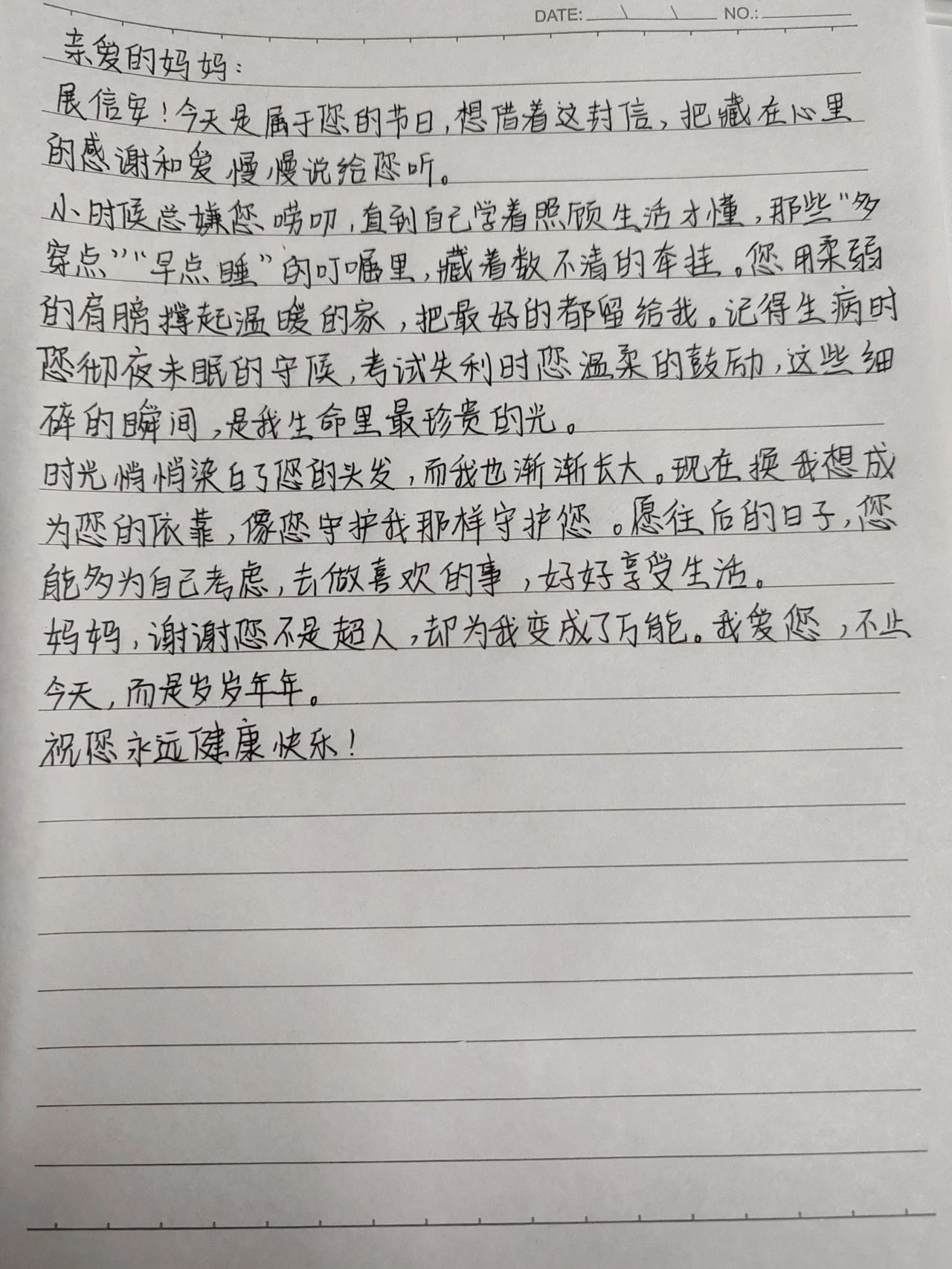 在快节奏的数字时代,学院发起“手写家书”活动,让同学们用最传统的方式,写下对母亲的感恩与思念。一封封家书将被寄往天南海北,带着墨香抵达母亲的手中。