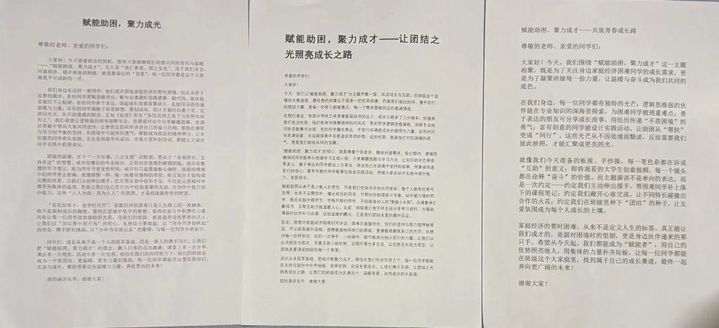 本次系列活动紧扣“聚内汇外,能力共生”“赋能助困,聚力成才”两大主题,以主题班会为依托,开展手抄报创作、主题演讲等特色活动,聚焦受助学生核心素养提升,整合校内外优质资源,推动资助育人从“物质帮扶”向“素养赋能”深度转型,助力受助学生在实践中锤炼品格、提升综合能力。活动中,受助学子分享成长故事、交流奋进感悟,深刻诠释了不惧困境、奋勇拼搏的成长真谛。学院借此引导学生深刻认识到,成才之路既需直面困境的坚定坚守,更离不开同伴间的携手同行、彼此支撑。未来,学院将持续搭建互助成长平台,鼓励学子争做成长路上的“同行者”,以自身优势帮扶他人、补齐自身短板,让每一位同学在学院大家庭中找准成长定位、绘就专属成长蓝图,携手奔赴美好未来。